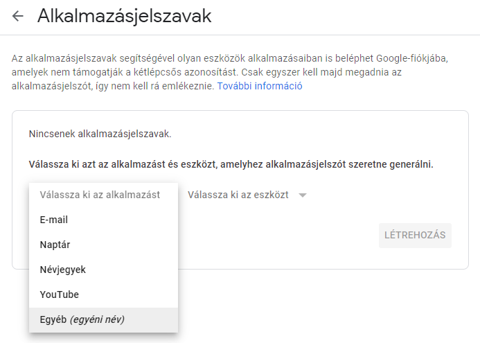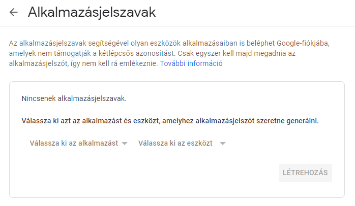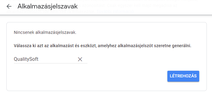 Egy tetszőleges név megadása után a Létrehozás gombbal lehet generálni alkalmazásjelszót: