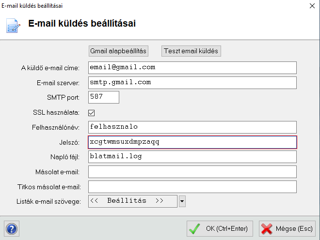 Ezután a programban az Egyéb->Beállítások->Rendszer működési beállítások (alap funkciók)->Email küldés beállításai menüpontban a jelszót be kell állítani a generált alkalmazásjelszóra: