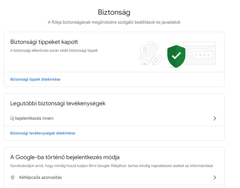 A biztonsági beállításokat az alábbi linken is elérheti: https://myaccount.google.com/security