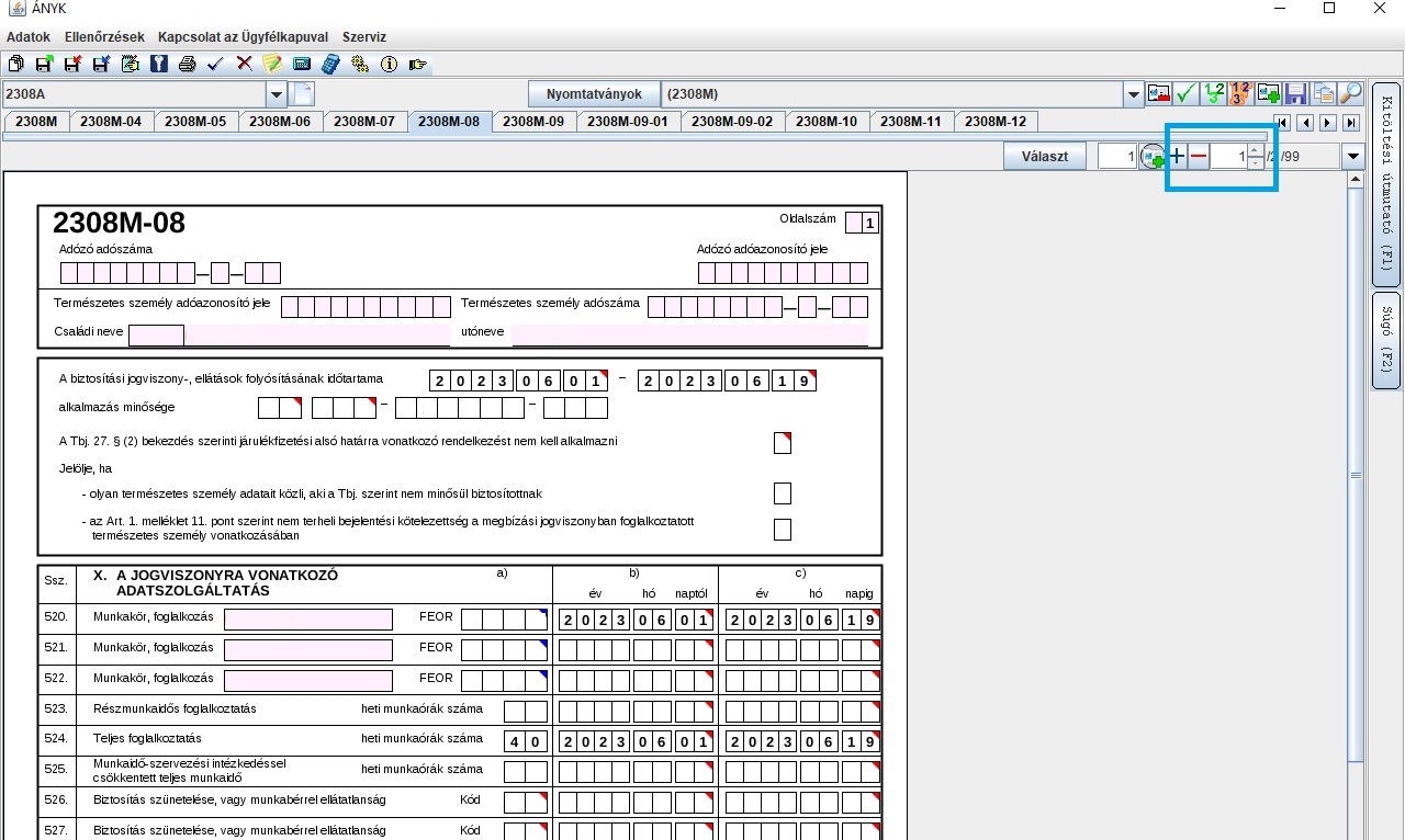 Amennyiben a dolgozó munkarendje egy adott hónapon belül is eltér, akkor a 08-as bevallás elkészítésekor az ÁNYK-ban a 2308M-08-as lapból két oldal fog generálódni az értintett dolgozóhoz. A lapok közt a képen kékkel bekeretezett mezőkkel lehet váltani.