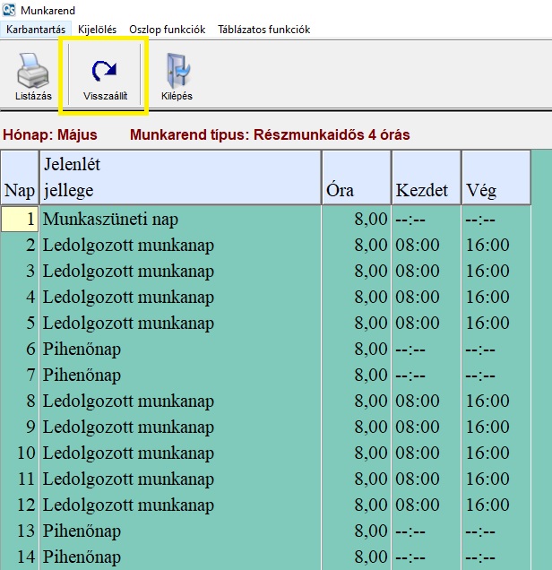 Például ha a dolgozónak korábban TM8 8 órás munkarendje volt, ami megváltozott a hónap nyitását követően RM4 4 órás munkarendre, akkor a munkarendet megnyitva minden munkanap esetében 8 óra fog megjelenni a korábbi beállításoknak megfelelően. A visszaállít gombra klikkelve át fognak állni a munkarendben szereplő napok 4 órásra.
