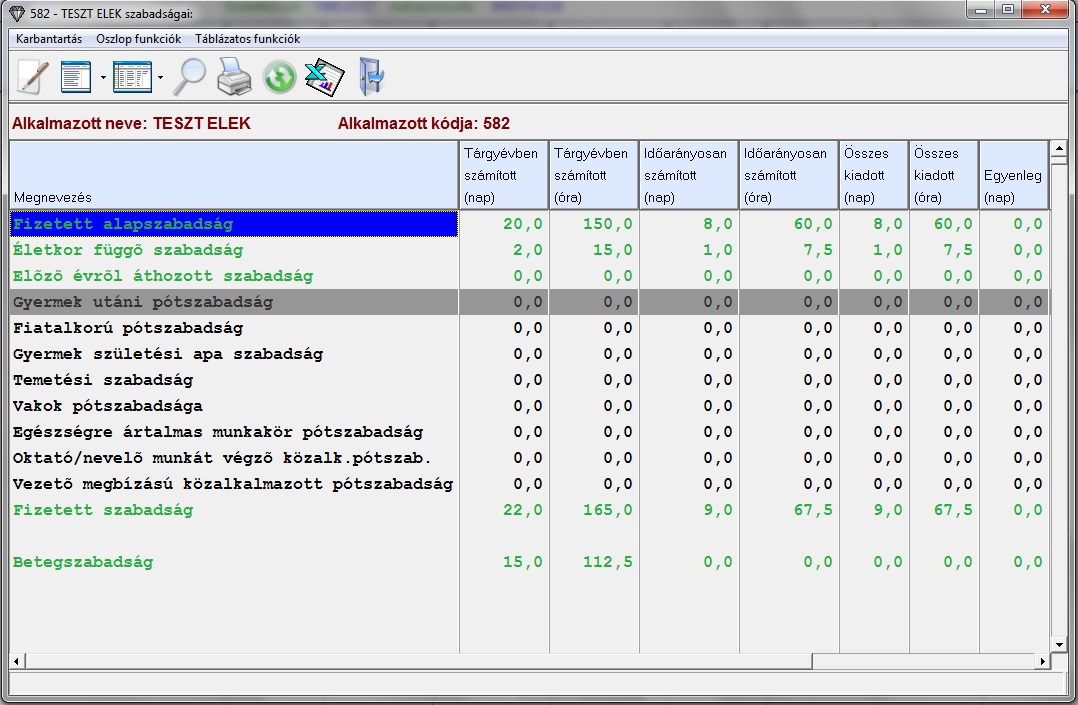 Tárgyévben számított (nap)/(óra): Az aktuális évben kivehető szabadságok időarányosítás előtti értéke. A zöld színnel kiemelt rekordok automatikusan számolódnak, ezek tartalma nem szerkeszthető.