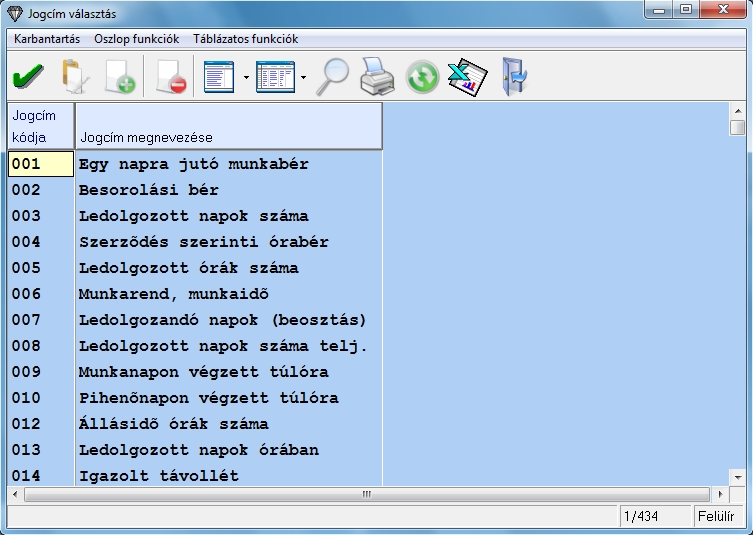 A menüpont elindításakor bejön egy táblázat mely tartalmazza az összes jogcímet, ezek közül ki kell választanunk azt amellyel végre akarjuk hajtani a kívánt folyamatot. Ezt az ENTER billentyű segítségével tehetjük meg.