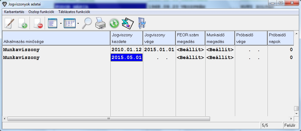 Elegendő, ha a Jogviszonyok menüpontban [+] gombbal felveszi az új jogviszonyt az új kezdeti dátummal. Ellenőrizze, hogy az előző jogviszonynál mindenképp legyen beállítva jogviszony vége dátum. Ezek után a dolgozó sorában állítsa még át a Munkába lépés kezdetét az új dátumra. Majd a Kilépés dátuma, Felmondás dátuma, Kilépés módja mezőket törölje. Ha bármi más megváltozott még a dolgozó adatainál, azokat is módosítsa. Ha ezeket a beállításokat elvégzi, akkor továbbra is elérhetőek a dolgozó régebbi bérszámfejtései, de a további számfejtéseket is ugyanehhez a dolgozóhoz rendeli hozzá.