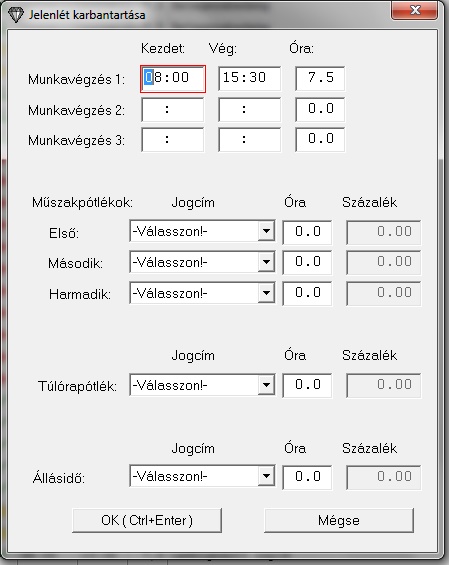 Az ablak felső részén 3 munkavégzés Kezdet, Vég, és Óra adata adható meg. (Később ezekből fogjuk automatikusan beállítani a túlóra és műszakpótlékokat.)
