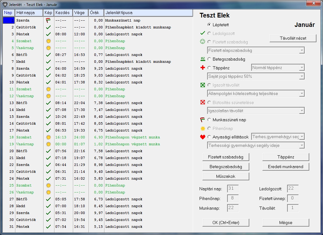 A rádiógombok aktívvá illetve inaktívvá válnak attól függően, hogy a táblázatban kiválasztott napra a munkarendben mi van beállítva (Munka-, Szabad-, vagy Ünnepnap). (Például: Szabadnapra nem lehet Betegszabadságot felvenni. Munkanapra pedig nem lehet ünnepnapot beállítani, ha a munkarend szerint nem ünnepnap az adott nap.)