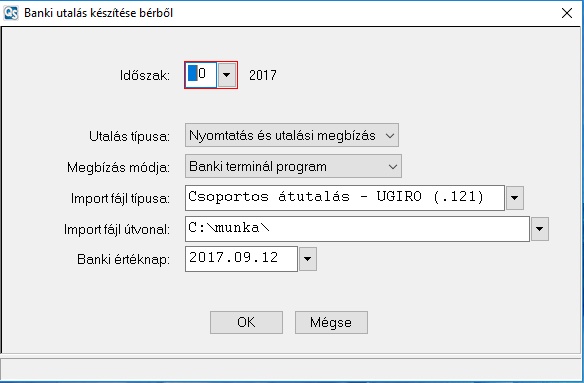 Havi teendők/Banki utalás készítése bérből menüpontban az alkalmazottak nettó utalandó munkabérének átutalásához készíthetünk egy import fájlt a kiválasztott banki fogadó programba.