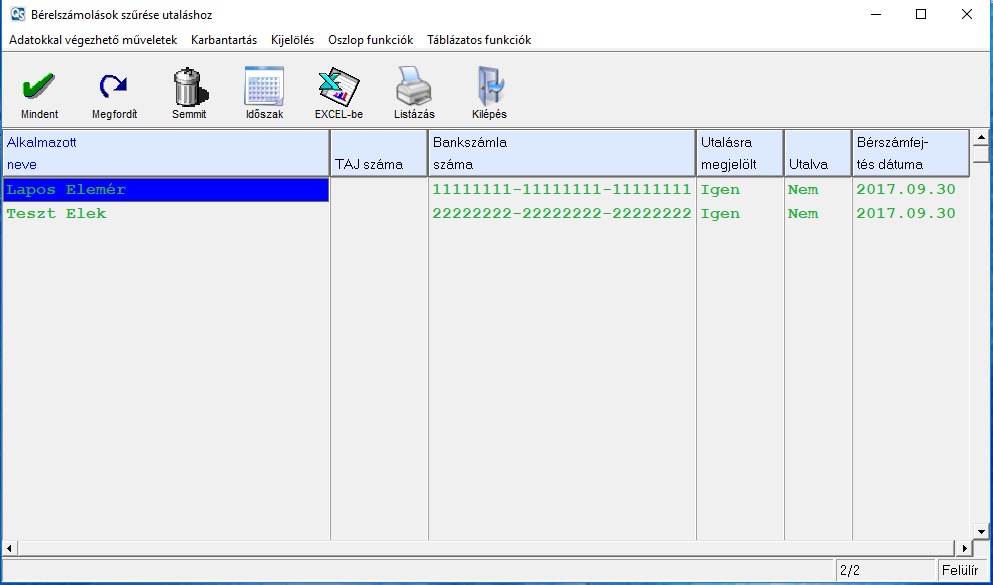 Az utalásra megjelölés mező Igen értéke esetén az adott dolgozó bekerül az utalási listába. Ekkor színes lesz a sor.