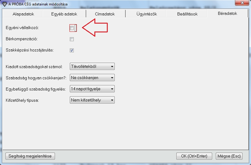 Első lépésként a a Karbantartások/Könyvelhető cégek karbantartása menüpontba kell belépnünk és a megfelelő soron vállalkozás során a módosításba kell belépnünk ("SPACE" gomb). A felugró adat módosítás ablakban a "BÉRADATOK" fülön betudja állítani, hogy egyéni vállalkozóról van szó.