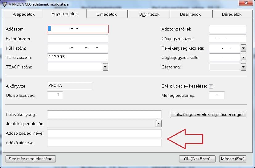 Miután beállított, hogy a vállalkozás egy egyéni vállalkozás ugyanitt az "Egyéb adatok" fülön megjelenik ezen beállítások után plusz két sor az Adózó nevéről. Ezeket töltse ki és már megfelelő lesz a 08-as bevallás főlapján a név adat.