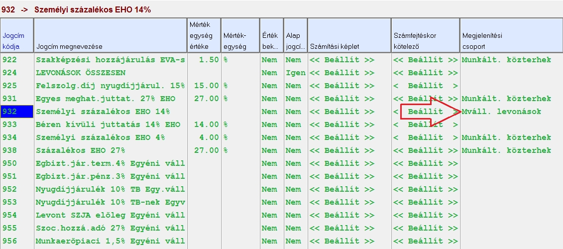 Ha hóközi számfejtéskor nem jelenik meg a 932-es Személyi százalékos EHO 14%-s jogcím és nem tudja hozzáadni, akkor a Törzsadatok / Jogcímtörzs karbantartása menüpont alatt a 932-s jogcím sorában a Megjelenítési csoport oszlopban "Enter" megnyomása után válassza ki az "M.váll levonások" értéket. Ezek után a Hóközi számfejtés módosításakor a Mváll.levonások fülön állva, már hozzá tudja adni a jogcímet.