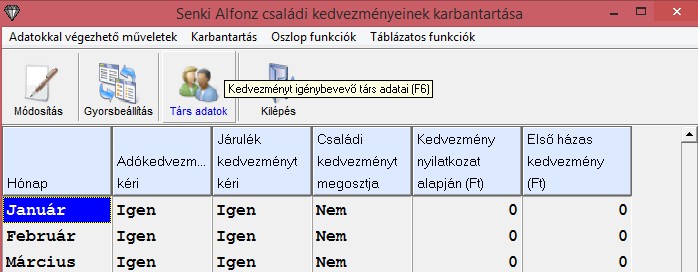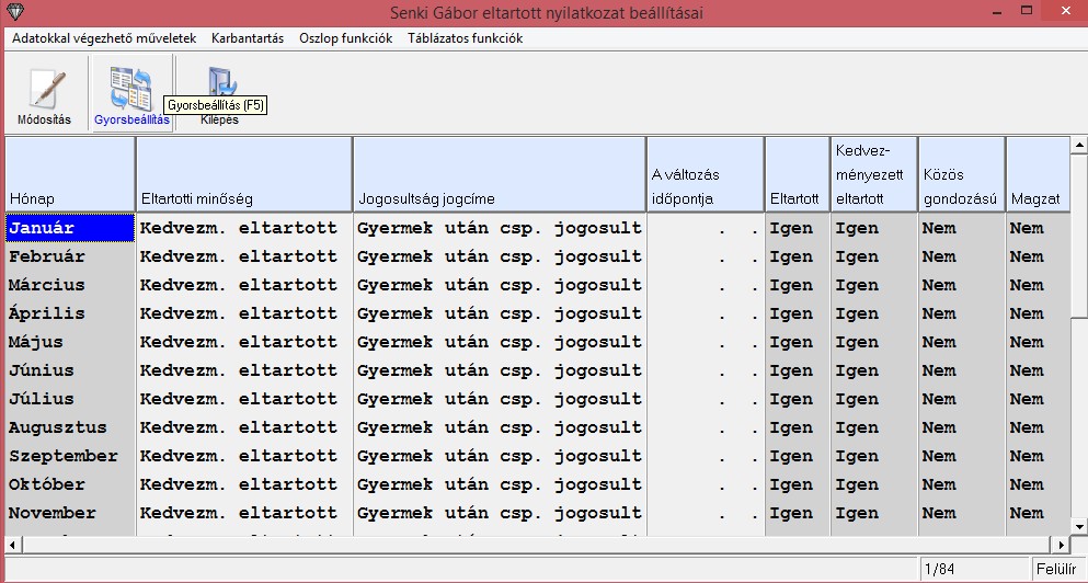Példa: a januári sor eltartotti minőség oszlopán állva megnyomjuk a gyorsbeállítás gombot és kiválasztjuk a kedvezményezett eltartott lehetőséget. Ekkor 1-12 hónap mindegyikében kedvezményezett eltartottra változik a státusz. Júliusban a dolgozó új nyilatkozatot ad, mely szerint már csak eltartott a gyermek. Ekkor a júliusi soron állva a 7-12 hónapok mindegyikét eltartott státuszúra módosíthatjuk.
