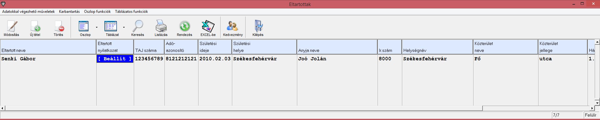 Az "Eltartott nyilatkozat" oszlopnál lehet beállítani a nyilatkozaton szereplő és a 08-ason elvárt "Eltartotti minőség" és "Jogosultság jogcíme adatokat". Ezek az oszlopok automatikusan változtatják az Eltartott, Kedvezményezett eltartott és Közös gondozású, illetve a Magzat oszlopok értékét. Ez utóbbiak közvetlenül már nem módosíthatók.