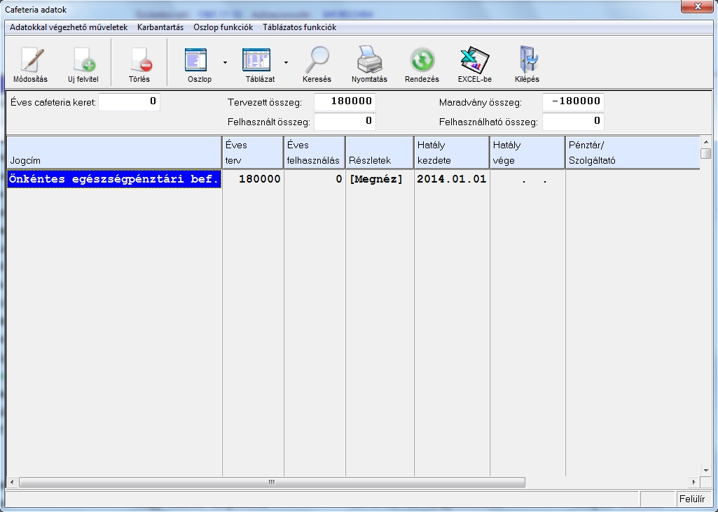 Az önkéntes pénztári, illetve SZÉP-kártya szolgáltató tagsági adatok a Törzsadatok/Személyi adatok karbantartása menüpont táblázatában a magán nyugdíjpénztári adatok utáni oszlopban Enter billentyű lenyomása után, vagy az ikonsoron a „Cafetéria” ikonra kattintással jeleníthetők meg.