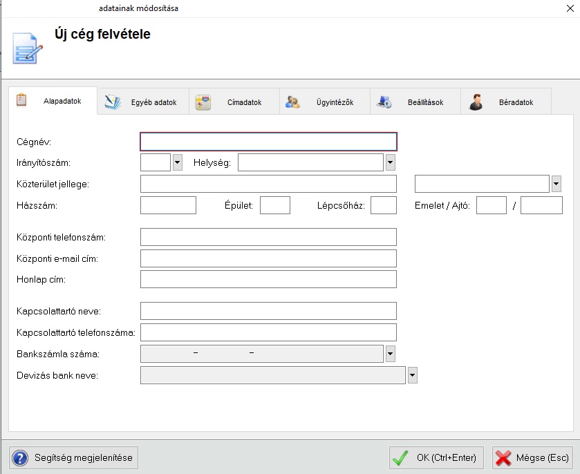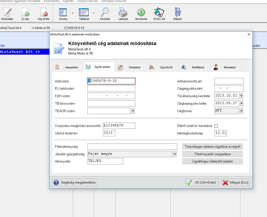 Az itt megadott adatok fontosak mivel számlázáskor az itt beállított cím, adószám, bankszámlaszám, telefon lesz a számla eladó oldalán, Maxbér modulban nyomtatványok kitöltésekor innen veszi a cég alapadatait. Nyomtatásokon az itt megadott cégnév lesz kinyomtatva.
