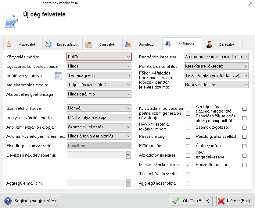 A "Beállítások" fülön további fontos adatok felvitelét lehet elvégezni, ilyen például a Könyvelés módja, Adótörvény hatálya vagy az Árfolyam felajánlás alapja.