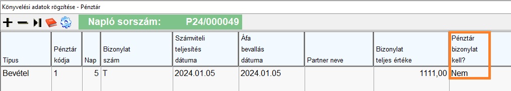 A "Csak megjelöltekről nyomtat" beállítás esetén a könyvelési képernyőn megjelenik egy "Pénztár bizonylat kell?" oszlop. Az oszlopon enterzve vagy duplán klikkelve állítható át "Igen"-re, ha ez az oszlop "Igen"-re van állítva, akkor készül csak pénztárbizonylat.