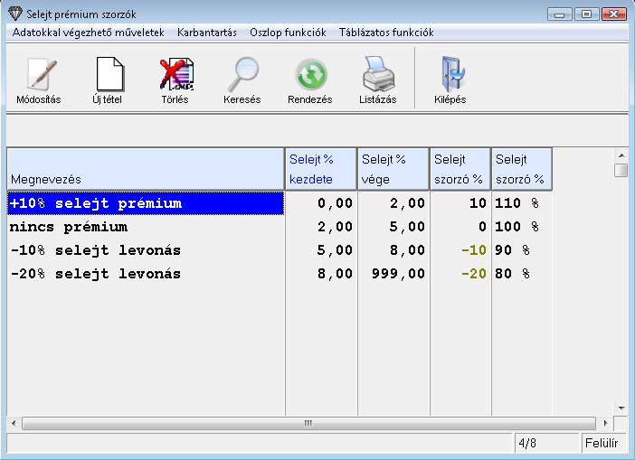 Programunkban a Teljesítménybér számfejtésekor lehetősége van a dolgozónak Selejt prémium bért számfejteni. Ez tulajdonképpen elsősorban egy negatív prémium érték számolás. Ehhez a Selejt szorzó tábla beállítása menüpontban be kell állítania a számoláshoz szükséges százalékokat. Fontos, hogy a "Selejt % vége" mező értéke egyezzen meg a következő kategória "Selejt % kezdete" mező értékével. A "Selejt szorzó %" mezőben tudja megadni, hogy az adott kategória hány százalékos változást jelent. Pl: -10% esetén 90%-kal számol a program.
