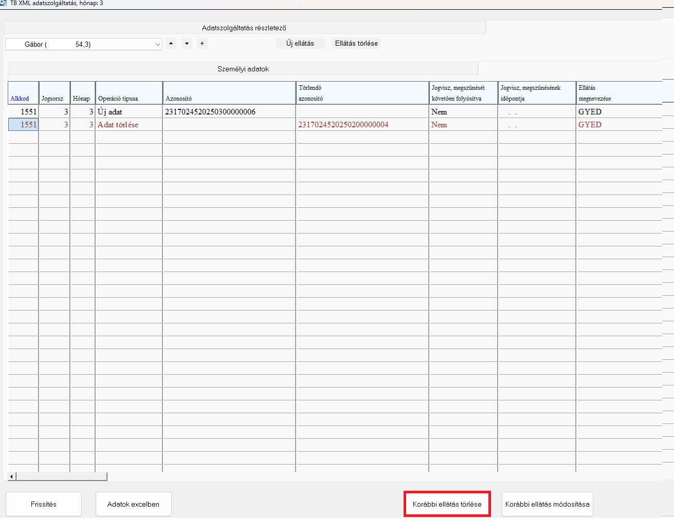 A Korábbi ellátás törlése gombbal, a hónap kiválasztása után, a program felvisz egy törlő sort, ez érvénytelenít egy hibásan beküldött ellátást.