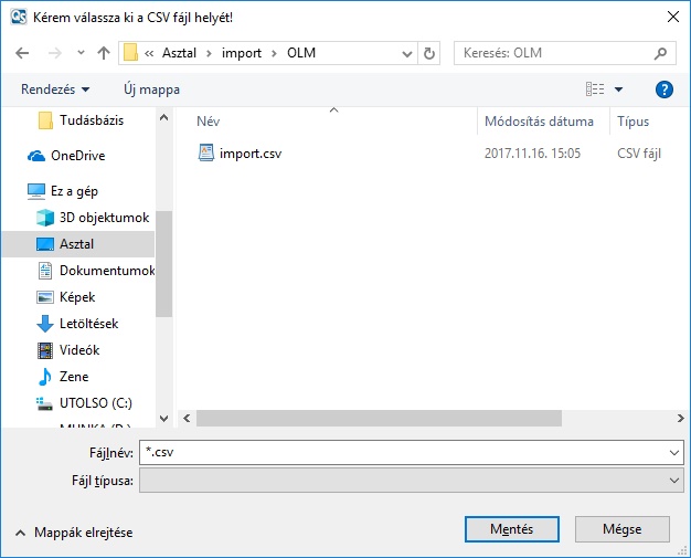 "ALT+ENTER" gombnyomásával, vagy a táblázat feletti "Kész" feliratú gomb megnyomásával lehet jóvá hagyni a beállított listát és elindítani az átadást. Ezután egy újabb felugró ablak nyílik meg, amiben ki kell választani a CSV fájl helyét, amit később az Online Munkaidő rendszerbe lehet importálni. A mentés gomb megnyomása után létrejön a fájl.