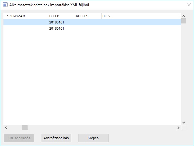 Az így létre hozott fájlt tudjuk majd beimportálni. A beimportálást a következőképpen hajthatjuk végre: A funkció a „Karbantartás -> Adatmentés, visszatöltés -> Alkalmazottak importálása 08-as XML-ből” menüpont alatt érhető el. A menüpont kiválasztása után, egy új ablak jelenik meg a kijelzőn. Az új ablak egy táblázatot, és három gombot tartalmaz. Az első gombra kattintva kiválaszthatja az importálni kívánt fájl helyét. Ezután a program megjeleníti a táblázatban az input fájlból beolvasott rekordokat, amiket az „Adatbázisba írás” feliratú gomb megnyomása után kiír a program az adatbázisba.