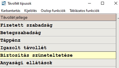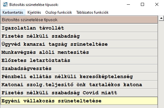 - A távollétekhez a megfelelő kezdő és végdátummal be kell rögzíteni a Biztosítás szüneteltetése/Egyéni vállalkozás szüneteltetése lehetőséget.