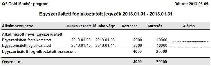 Az egyszerűsített foglalkoztatottak számfejtésének rögzítése után a munkavállaló bérlistáját a Listázások/Egyszerűsített foglalkoztatott bérlista menüponton keresztül érheti el. Itt konkrét időszakra lekérve a listát dolgozónként láthatja a rögzítésben felvitt egyes bér, valamint közteher kifizetéseket az adott időszakra.