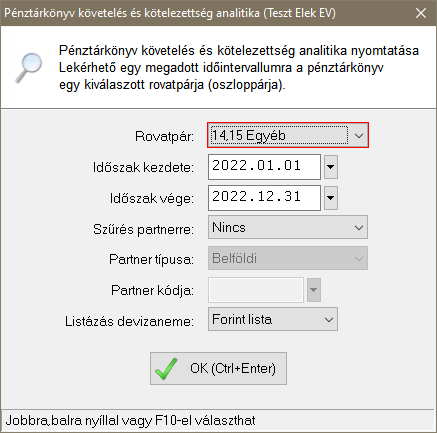 A "Listázások/Követelés és kötelezettség analitika" menüpontban érhető el egy analitikus lista, ahol a pénztárkönyvben vagy naplófőkönyvben lévő kiválasztott rovatpárra könyvelt tételeket lehet lekérdezni.