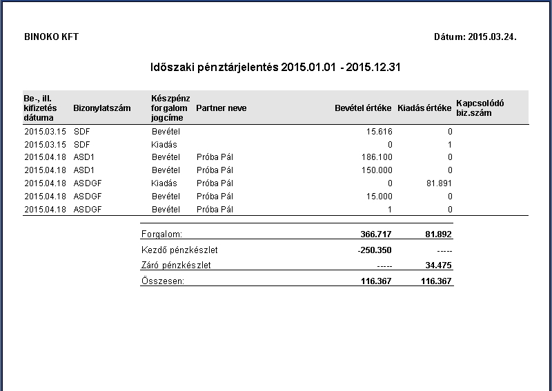 Az adatok megadása után a program elkészíti nyomtatható formában az adott pénztárban történt pénztármozgások időszaki pénztárjelentését. Automatikusan meghatározza a nyitó, valamint a záró pénzkészletet. Jelentés készülhet az adott intervallumon belül naponta vagy összesen.