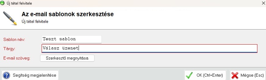 Ezután szabadon megadható a sablon neve, tárgya, valamint itt adhatjuk meg a hozzá tartozó felvinni kívánt szöveget.