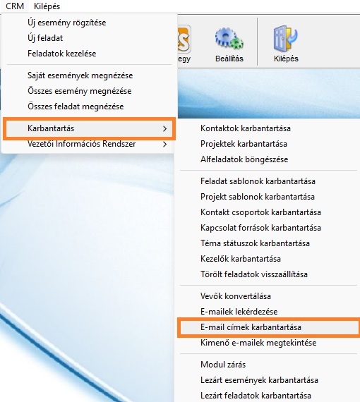Új email sablonok felviteléhez az alapképernyőn állva nyissa meg a CRM\ Karbantartás\ Email címek karbantartása menüpontot.