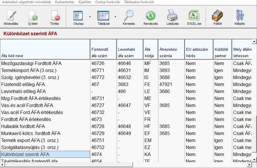b.) Szükség esetén dönthetünk úgy is, hogy nem a fizetendő vagy a levonható áfát adjuk meg a tételek könyvelésekor, hanem létrehozunk külön áfa kódokat amin kezeljük a tételeket.