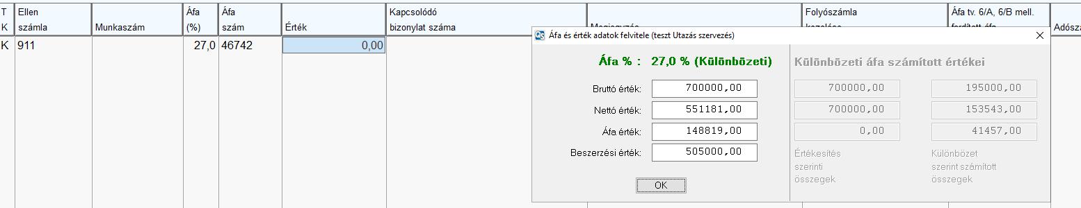 Itt kell megadni az adott tétel beszerzési értékét , amiből a rendszer ki fogja számítani a különbözeti áfát. Az eladási érték és a beszerzési érték különbözetére fog áfát számítani a program, amit egy vegyes soron különálló áfaként fog rögzíteni a rendszer (az áfa szám szemben az alapadatokban megadott átvezetési számmal). A teljes eladási érték pedig áfa körön kívüliként kerül automatikusan rögzítésre a vevőre és az ellenszámláre (árbevételre