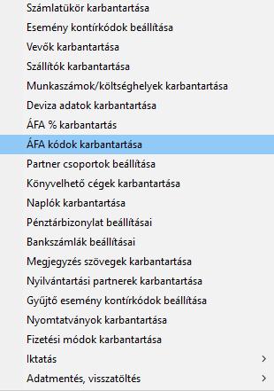 1. A Karbantartás\Áfa % karbantartása menüpontba belépve szükséges felvinni a 0%-os áfa %-ot.