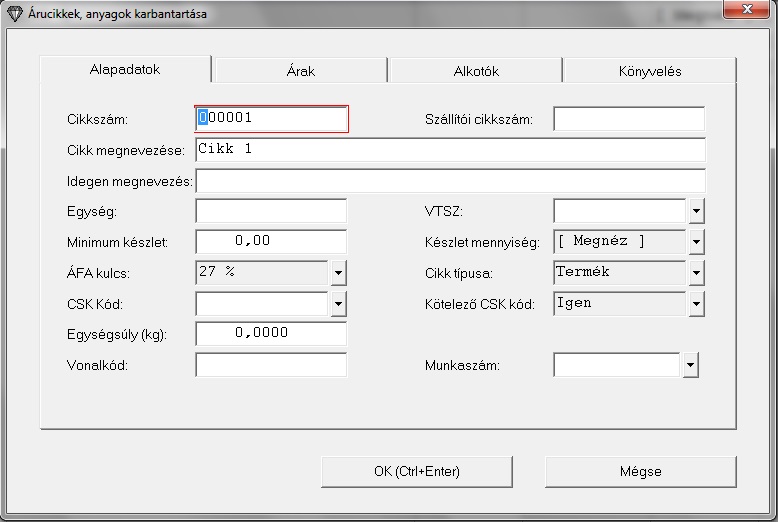 Az ablakban lévő bekérő mezők, megfelelnek az Árucikkek, anyagok karbantartása táblázatban található oszlopoknak.
