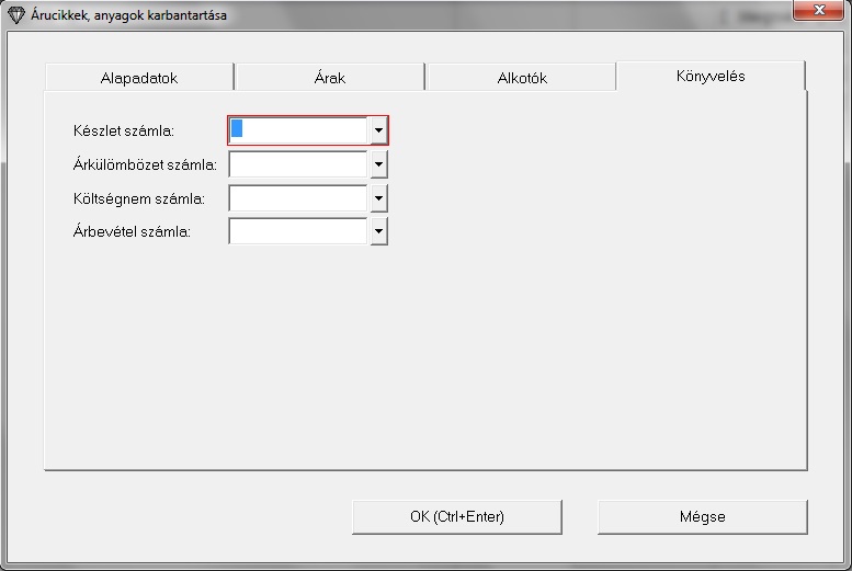 Árkülönbözet számla: Minden anyaghoz megadható, hogy mi legyen a hozzá tartozó árkülönbözet számla. Könyveléskor ez a számlaszám fog automatikusan megjelenni készlet növeléskor a Követel rovatban. Az árkülönbözet számlának a számlatükörben léteznie kell, és az F10 billentyűvel ki is lehet onnan választani.