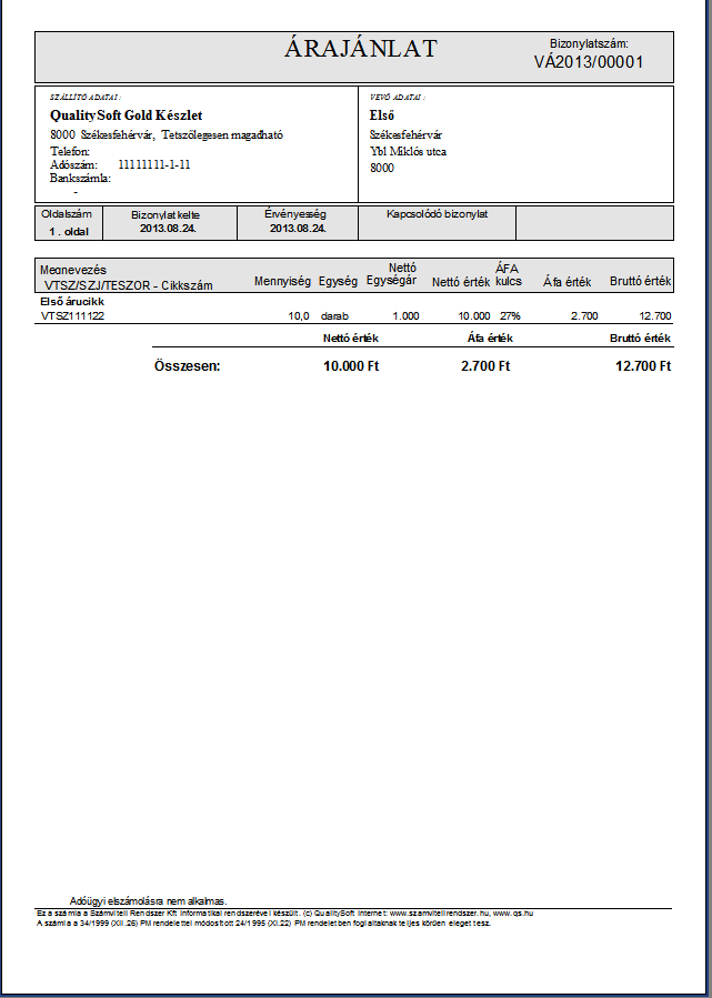 A számlázó programmal árajánlat is készíthető. Az árajánlat hagyományos bizonylatként rögzül, tehát visszakereshető és nyomtatható. Az árajánlatnak megadhatja az érvényességét, a szállítás módját és a fizetési határidejét is. Logót és tetszés szerinti szövegezést, megjegyzést is feltüntethet. Az árajánlatból egy gombnyomással készíthető megrendelés, díjbekérő vagy számla, melyek kapcsolódó bizonylatként hivatkozni fognak az árajánlatra, így az visszakereshető.