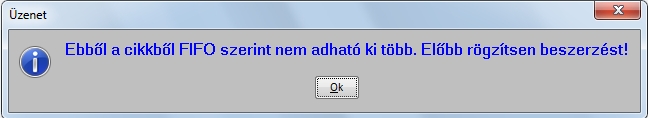 Első lépésként az adott cikkből bevételezésre felveszünk x db-ot, hogy megkezdhessük a FIFO elv szerinti készlet kezelését. Ameddig ezt nem tesszük meg a program, nem enged kiállítani kiadás elvű bizonylatot és felszólít minket a bevételezésre egy üzenetben.