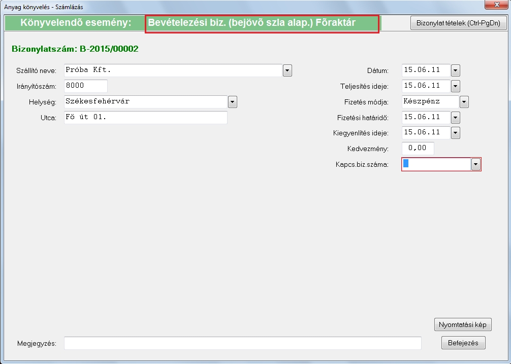 A bizonylat kiválasztása után legelőször ki kell tölteni a bizonylat adatait, miután ezt megtettük felvihetjük a raktárba bevételezésre kerülő cikkeket, (Ez a példánkban egy bizonylatra történik, hogy jól szemléltethető legyen a FIFO elv.) lásd a mellékelt képen. A képen piros kerettel megjelöltük a fontos adatokat amelyek a FIFO elv működéséből fontos. Ezek az adatok a cikk adatai valamint a darabszám és az érték.