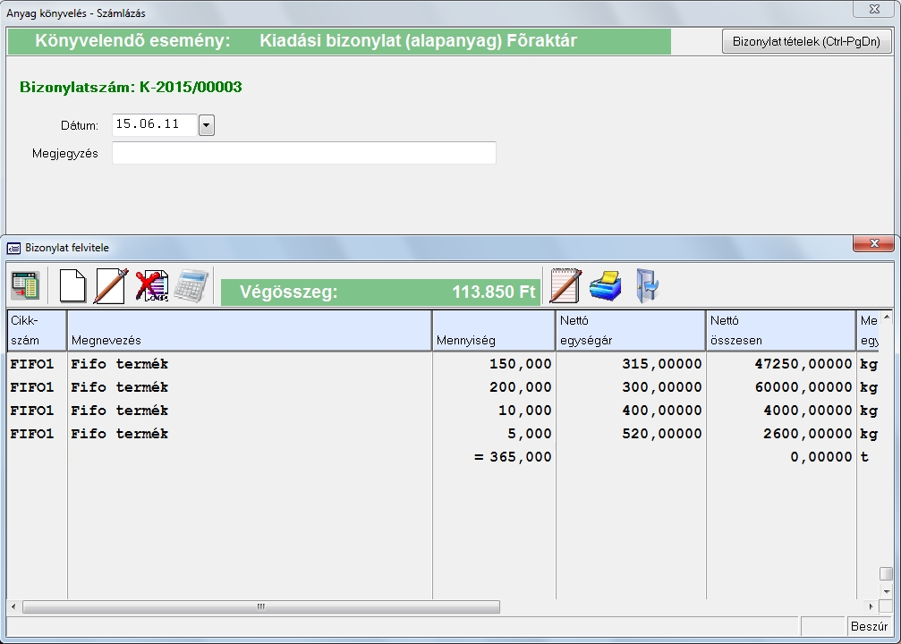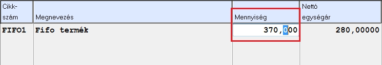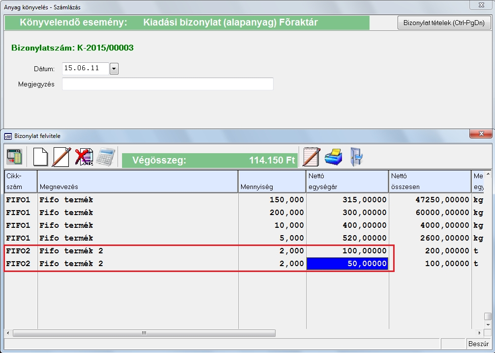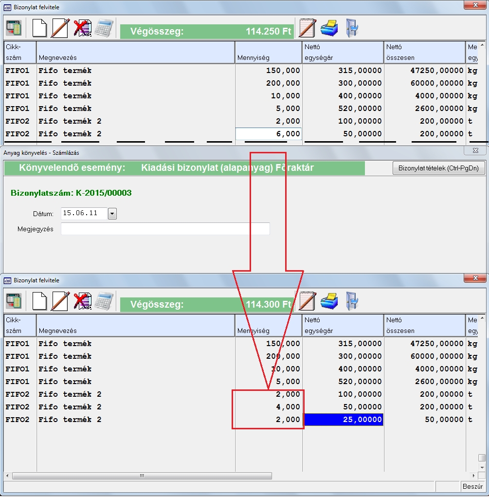 Miután lerögzítettük az adatokat, de kiderül, hogy többet kellett volna rögzíteni akkor átírhatjuk a darabszámot és a program újra számolja a felosztást. Ehez a bevételezés során felvett "Fifo termék 2" (16 db összesen) nevű cikkünket fogjuk kiadni. A kiadás menete a fentebb ismertetett. Ebből a termékből először felveszünk 4 db-ot amelyet a FIFO elv szerint feloszt a program.