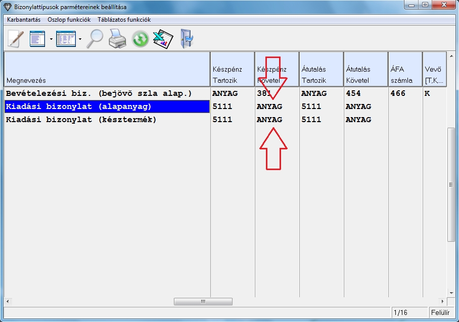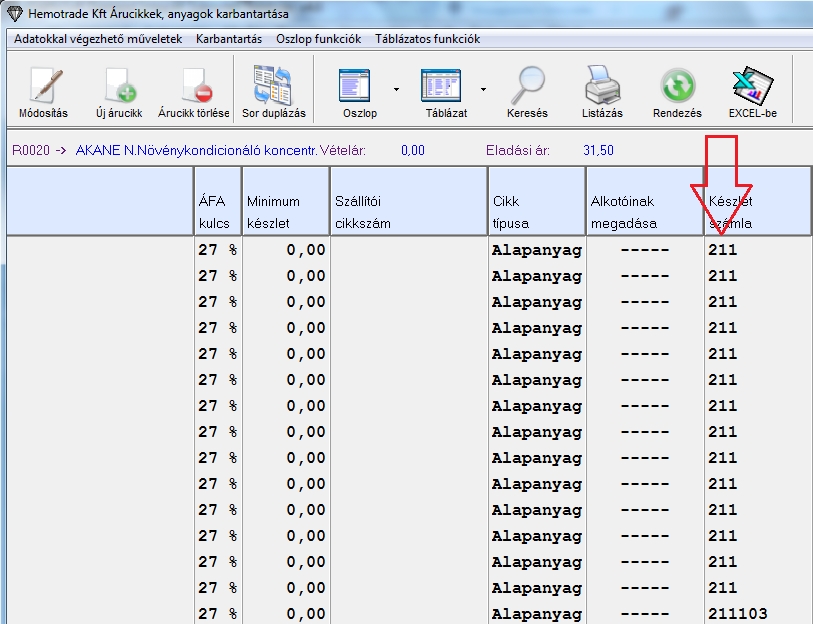 Első lépésként a Karbantartás / Árucikkek, anyagok karbantartása menüpontban be kell állítani felvett anyagokhoz és árucikkekhez az Anyag könyvelési főkönyvi számokat.