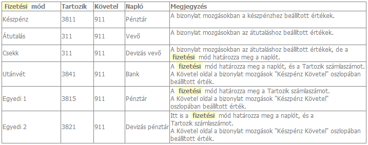 Ezekkel a beállításokkal a következő módon fogja a rendszer főkönyvnek feladni a különböző fizetési módokkal kiállított bizonylatok: