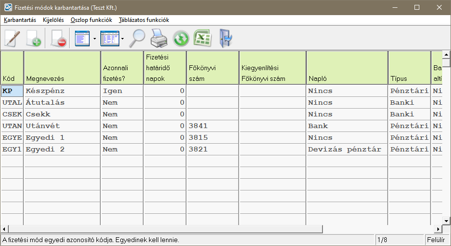 Alap fizetési mód: Ez az oszlop csupán információadásra szolgál. Azt jelzi, hogy a rendszer alap fizetési módjáról van-e szó, vagy az ügyfél által létrehozottról. Jelentősége, hogy alap fizetési módot nem lehet törölni és átnevezni.