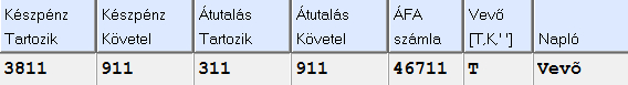 Főkönyvi szám: Megadható, hogy melyik főkönyvi számra könyvelődjön az ilyen fizetési móddal kiállított bizonylat. Az, hogy a Tartozik vagy a Követel oldalra kerül-e ez a szám a rögzítés során, az attól függ, hogy a "Bizonylattípusoksok beállítása" menüpontban a "Vevő [T,K,' ']" oszlopban mi szerepel. Ha T, akkor a Tartozik, ha K, akkor a Követel oldalon fog szerepelni. A másik oldalon pedig a bizonylattípusokban beparaméterezett másik oldali számlaszám attól függően, hogy a fizetési mód pénztári vagy banki típusú-e. Ha a "Vevő [T,K,' ']" oszlop üres, akkor a fizetési módhoz megadott számlaszám nem lesz figyelembe véve.