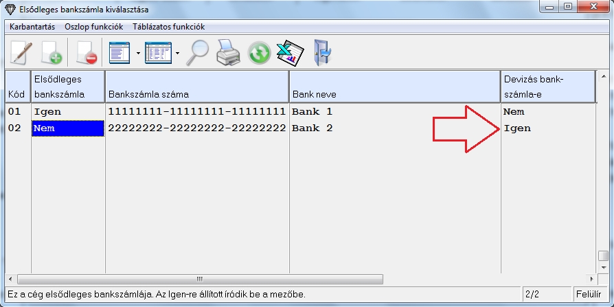 Itt a Devizás bankszámla-e oszlopon tudjuk beállítani a típusát a számlának. Ha itt igen áll akkor a devizás számláknál ezt ajánlja fel a program.