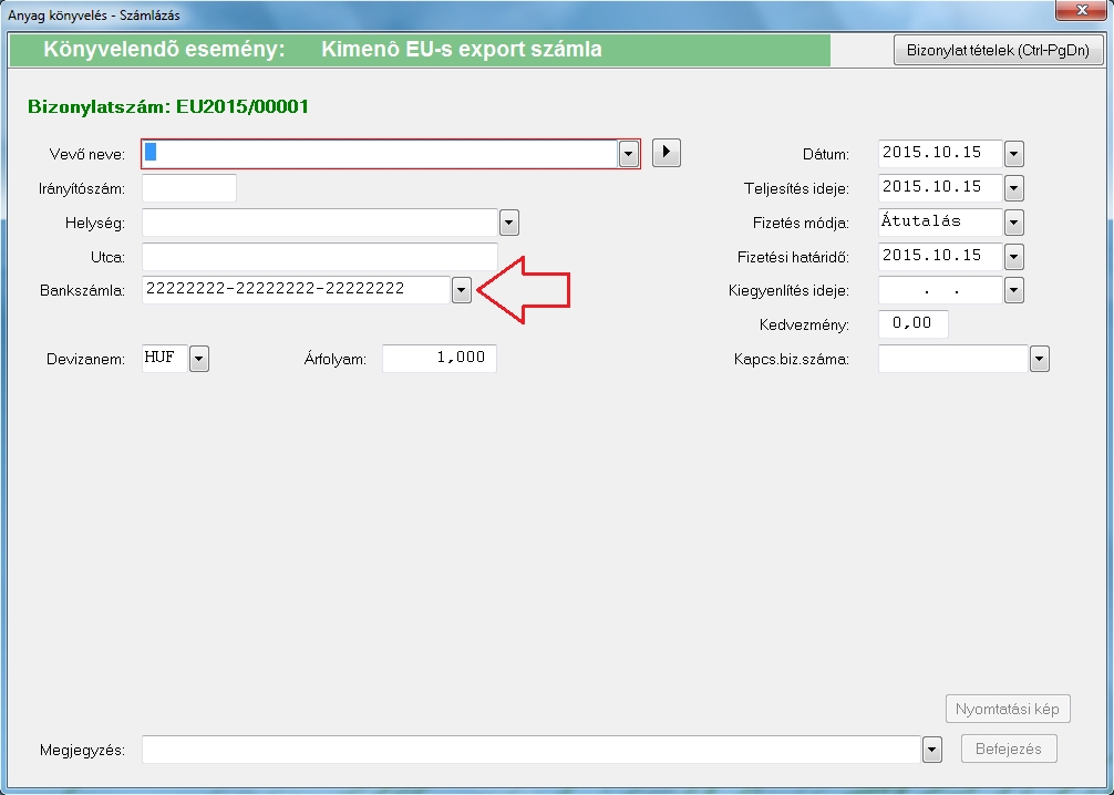 Fontos! A program alapból a könyvelt cégek karbantartásánál megadott számlaszámot veszi alapul, amennyiben a bankszámlaszámok beállítása menüpontban van megadva számlaszám, akkor az a lebillenő ablakból kiválasztható lesz.