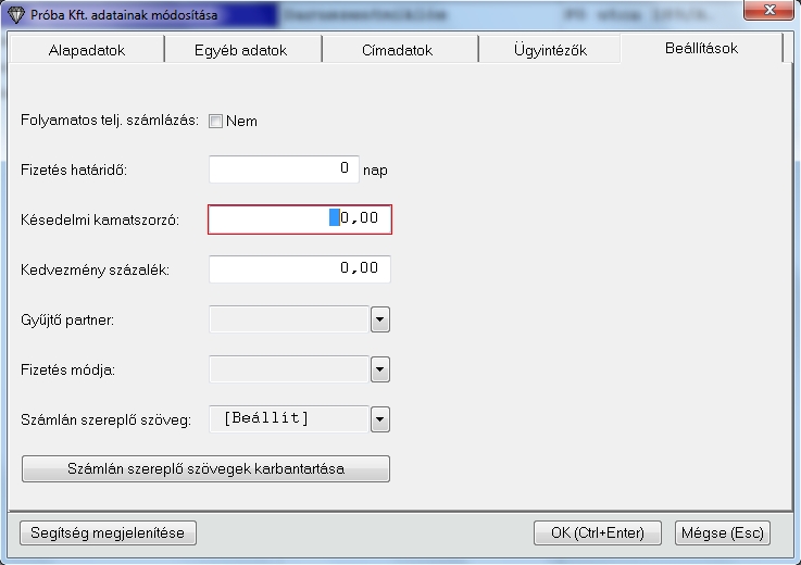 Lehetőségünk van vevőnként más és más késedelmi kamatot beállítani.