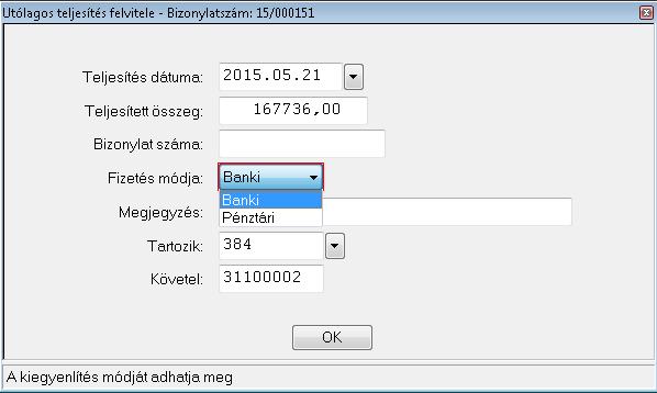 Az adott bizonylaton állva kiegyenlítheti a bizonylatot megadott dátummal.Itt fel lehet vinni teljesítést (teljes összegű kiegyenlítés) vagy részteljesítést egyaránt. Az Utólagos teljesítés dialógus ablakában meg kell adni a teljesítés dátumát és az összegét.Ha a teljes összeg utalásra került akkor teljes a kiegyenlítés, ha csak egy része akkor a megadott dátumra részkiegyenlítés. Utóbbi esetén a fennmaradó összeget nyilvántartja a program.