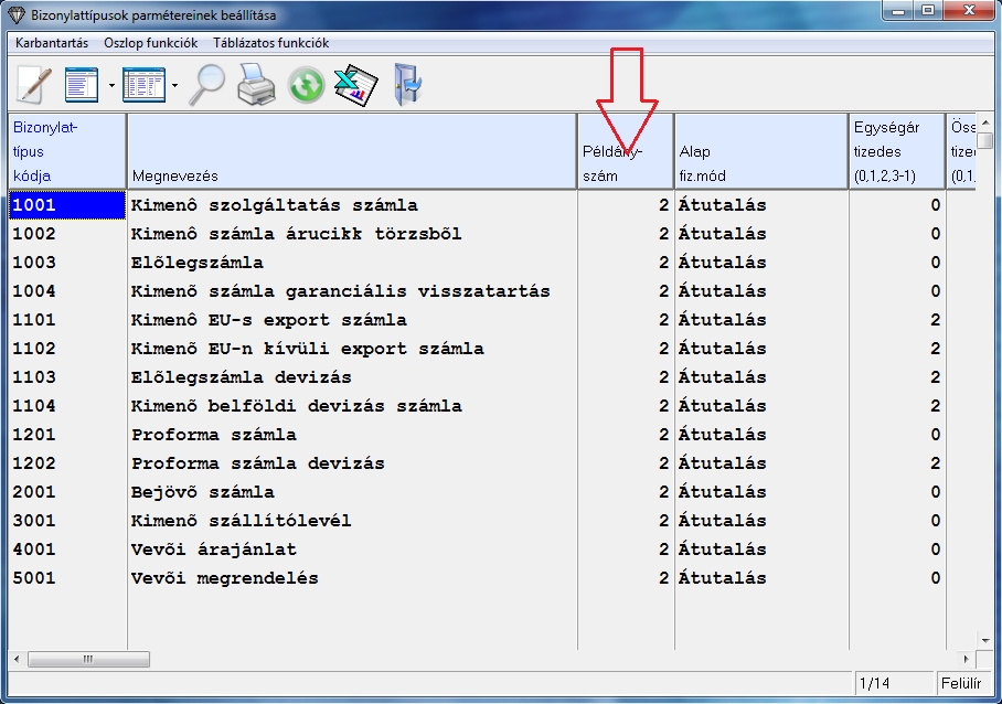 A menüpontban belépve látjuk az összes bizonylat (számla) típusunkat, itt a táblázatban a példányszám oszlopba tudjuk megadni hány darab példányban nyomtassa a program a számlát.