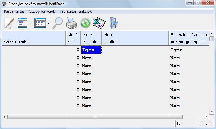 Nyomjon egy entert a [beállít]-on. A megjelenő ablakban, töltse ki a szövegcímkét(ez jelenik meg majd a bizonylat kitöltésnél, a mezőhossznál adja meg a karakter hosszúságot. A mező megjelenjen állítsa igenre. Az alapfeltöltést az ismétlődő adatoknál használhatja, ezt csak akkor érdemes kitölteni, ha a szövegdobozban mindig ugyanaz az adat jelenik meg.
